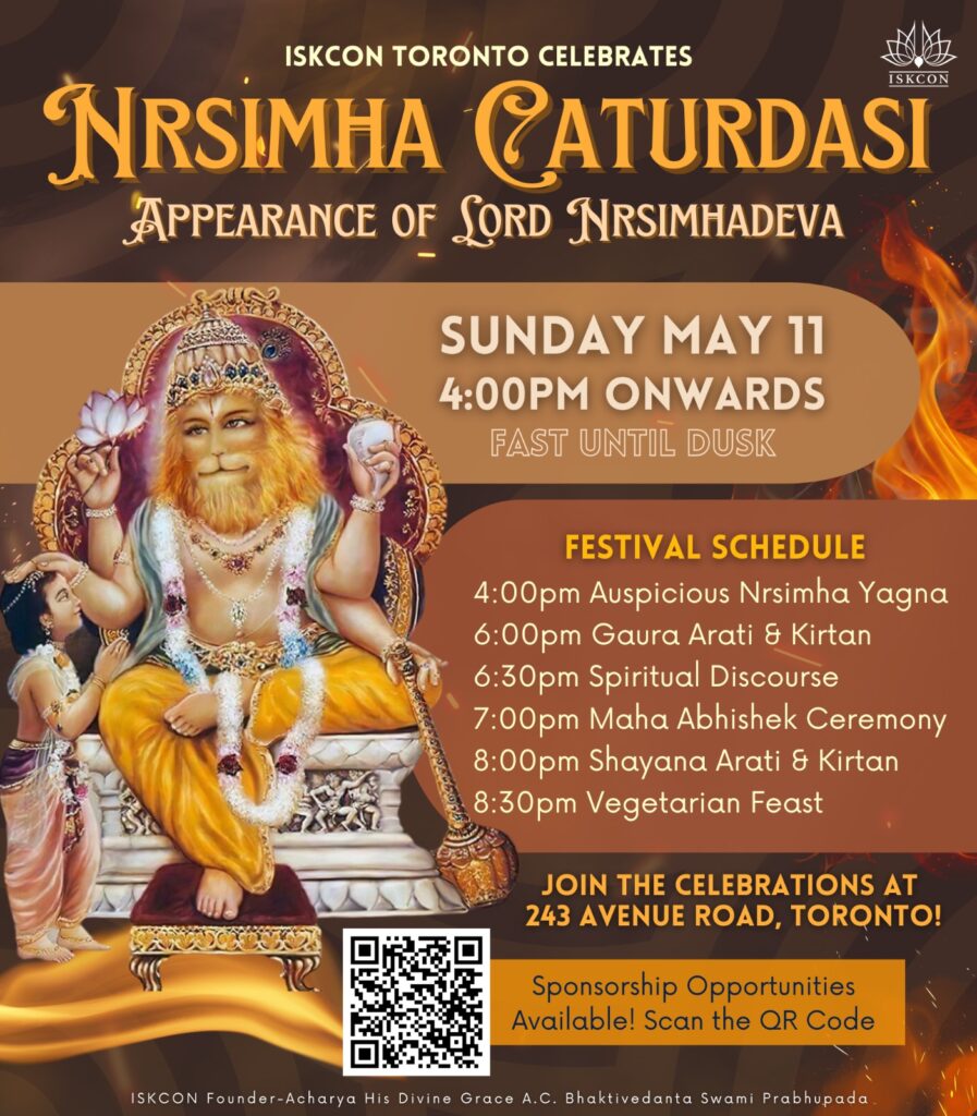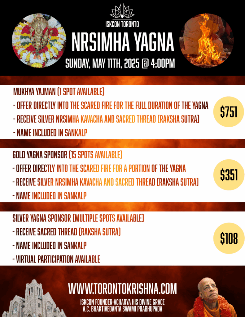 The festivities will continue after the Yagna with the Nrsimha Caturdasi Festival program. This will include aratis, kirtan, spiritual discourse, and an abishekka ceremony. For more information, see the poster below:
