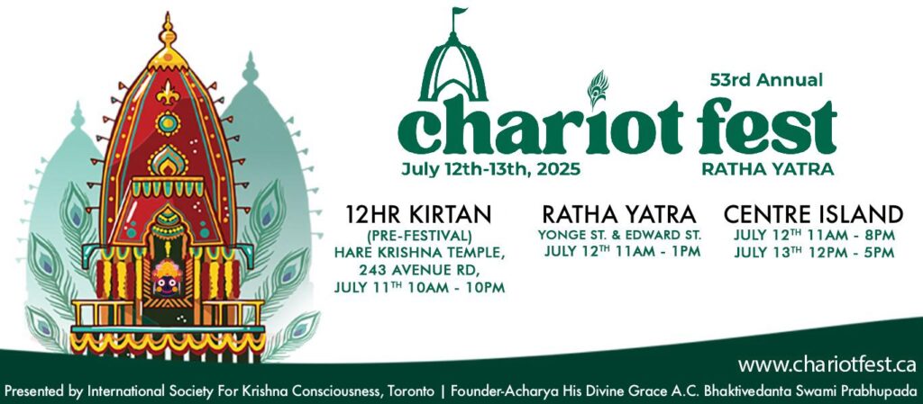 | The streets of Toronto are about to come alive with chanting, dancing, and divine celebration! With hearts full of anticipation and devotion, we joyfully welcome you to the 53rd Annual Chariot Fest (Ratha Yatra – formerly known as Festival of India), hosted by ISKCON Toronto.