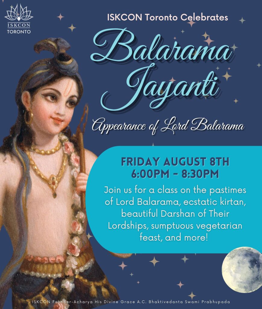 The auspicious appearance day (birthday) of Sri Balarama, Sri Krishna’s older brother is Friday, August 8th! Lord Balarama symbolizes strength and compassion – and we all could do with a little bit of that! So we invite you to take part in the celebrations at the Hare Krishna Temple. Festivities will begin at 6pm and continue till 8:30pm. Devotees are encouraged to dress in blue to honor Lord Balaram.