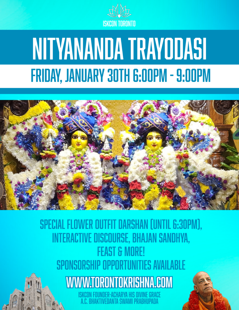 This festival has always been a fan-favorite amongst devotees at ISKCON Toronto. There are a few traditions at ISKCON Toronto for this occasion. Firstly, devotees are encouraged to dress in blue, which is Lord Nityananda’s favorite colour! Additionally, we offer a flower outfit to Sri Sri Gaura-Nitai (darshan available until 6:30 pm). The main festivities will begin at 6pm and will feature an interactive discourse and a “Bhajan Sandhya” where devotional songs about this great personality will be sung. In this special feature, we will use the beautiful musical compositions of our tradition to go deeper into the personality of Sri Nityananda Prabhu. We are also pleased to announce that HG Kalakantha das (ACBSP) will be present for the festivities.