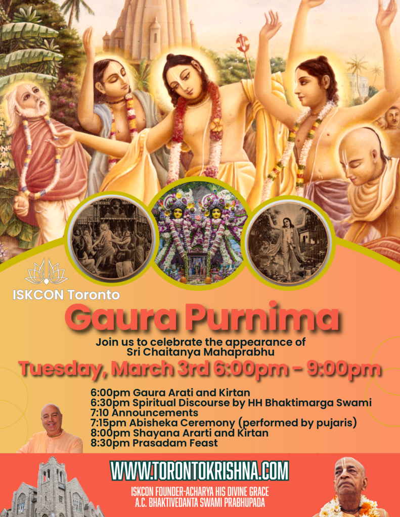 We cordially invite you to one of our biggest festivals of the year, the appearance day of Sri Chaitanya Mahaprabhu. This year Gaura Purnima falls on Tuesday, March 3rd, 2026. We are delighted to share that we’re hosting a grand celebration! Gaura or Lord Chaitanya appeared in a small town in eastern India over 500 years ago to spread the congregational chanting of the holy name and remind us of the timeless wisdom in the texts of Srimad Bhagavatam and Bhagavad Gita. He encouraged everyone to educate themselves on the practicality of these teachings in the 21st century and to share this confidential knowledge of success with others.
